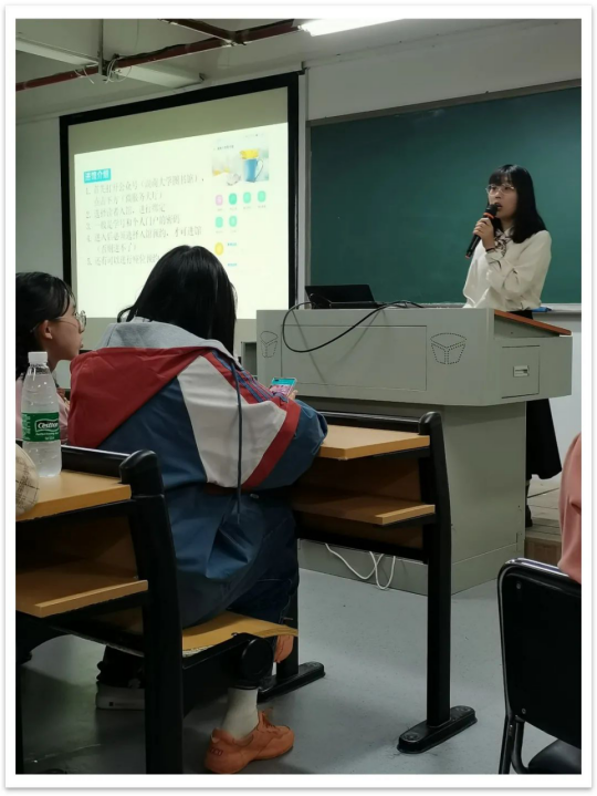 会议第三项,答疑环节 。刘培正、陈瑞嘉、夏宇、都彦颖、郑欣雨、黄惠青和王绍艇同学依次上台为同学们解答疑惑。主要围绕入党须知、校园周边交通、慕课学习、图书馆概况、研楼内部路线、食堂以及各种校园小程序等方面进行详细介绍。其中,夏宇同学细致地介绍了图书馆四个馆舍的地理位置,开放时间以及每个楼层的功能特点,并重点强调了入馆需提前预约这一事项。