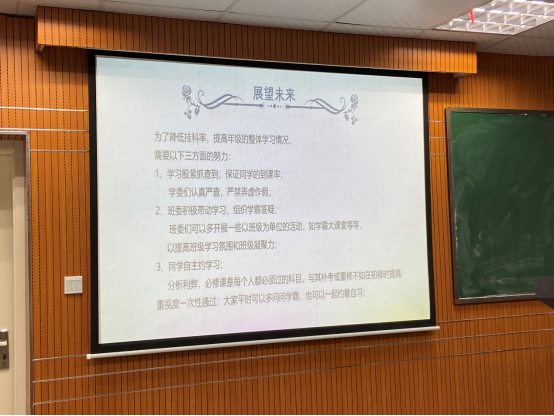 会议第三项,由19级辅导员张屾进行2019年度成绩分析。张屾老师对大一重要学科如数学分析、高等代数、计算机导论、空间解析几何等均制作了详细的分析图标以及各班情况对图,他指出2019年成绩都不理想,年级平均加权平均分较低,且两极分化程度大。所以在后面的同学还需要加一把力,成绩较好的同学也尽量帮助一下靠后的同学,大家共同学习,共同进步。