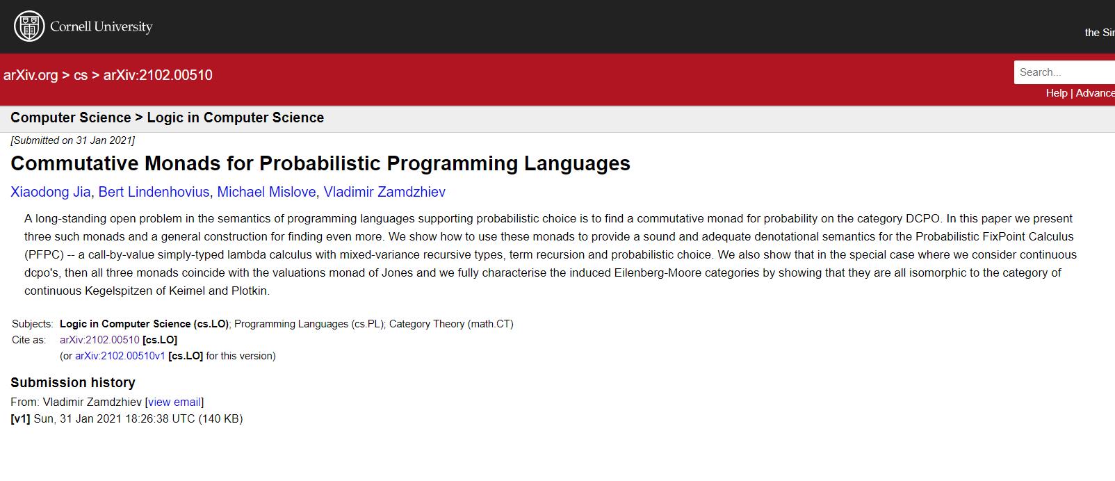 的贾晓东博士(第一作者)与合作者的论文“Commutative Monads for Probabilistic Programming Languages”在LICS2021发表。LICS(ACM/IEEE计算机科学逻辑国际会议,ACM/IEEE Symposium on Logic in Computer Science)是理论计算机科学领域最顶级的国际会议之一,成果代表着理论计算机科学的前沿,自1986年在剑桥大学首次举办至2020年,共计有9篇签署国内第一单位的论文在LICS发表。2021年,共3篇签署国内第一单位的论文被LICS接受,分别是中国科学院、复旦大学和色情文学