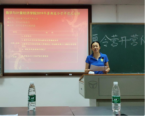数学院暑期夏令营开营仪式。参加会议的各位领导和老师分别是副院长黄勇老师、副院长郭上江老师、副院长雷渊老师、学院党委书记程卓蕾老师、学院党委副书记熊雅老师和研究生秘书王郁芬老师,研究生代表胡琛学姐,以及36名2019暑期夏令营营员。本次大会共分为四个部分,会议由程书记主持。