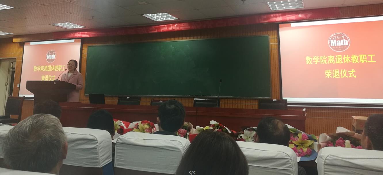 接下来欢送会进入高潮,八位退休教师上台,蒋月评院长和程卓蕾书记为每一位老师颁发了“光荣退休”的荣誉证书。年轻教师上台献花,这一幕意味着传承,数学院的接力棒也将逐步传递给年轻教师。献花结束后,胡跃荣老师作为退休教师代表上台,感谢学院领导和同事的关心。他说自己已经在湖大工作了一辈子,对色情文学