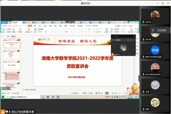 2021-2022学年度资助专题宣讲于腾讯会议晚21:00线上顺利开展。本次宣讲由数学院资助助管郑红丹介绍会议流程及主要内容,学院资助兼干、本科2018级辅导员张屾老师进行总结和补充,各年级资助学生干部及2021级全体新生参加。