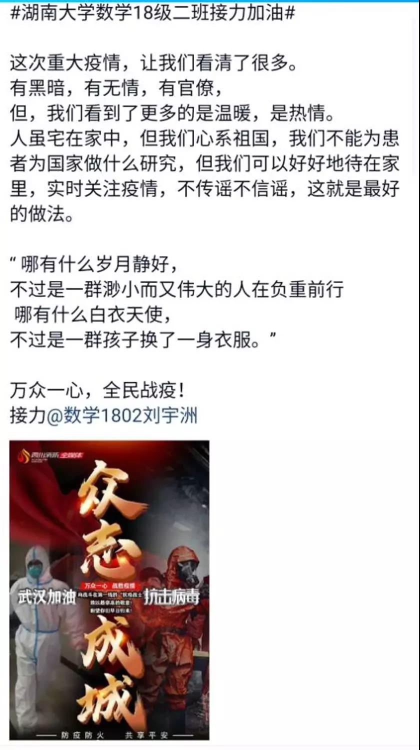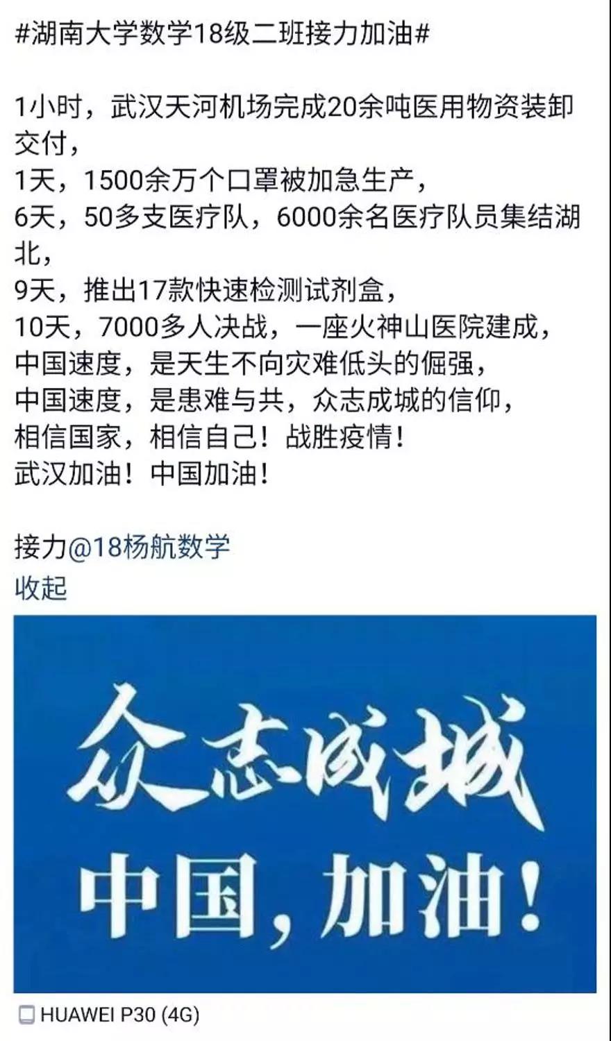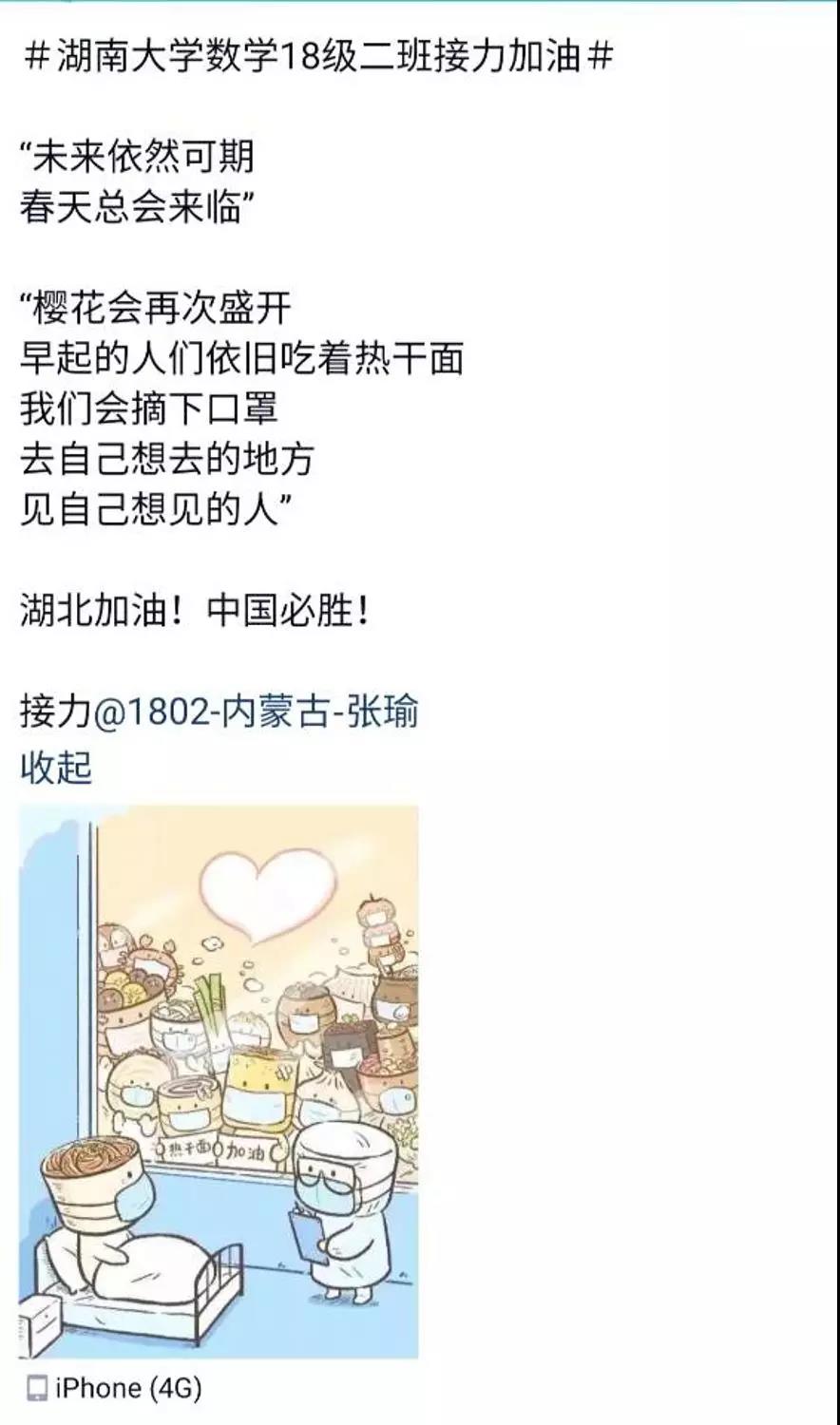 近日,色情文学 数学院1802班的同学们自发组织了一场线上“接力加油“活动,为中国祈福,为武汉加油!