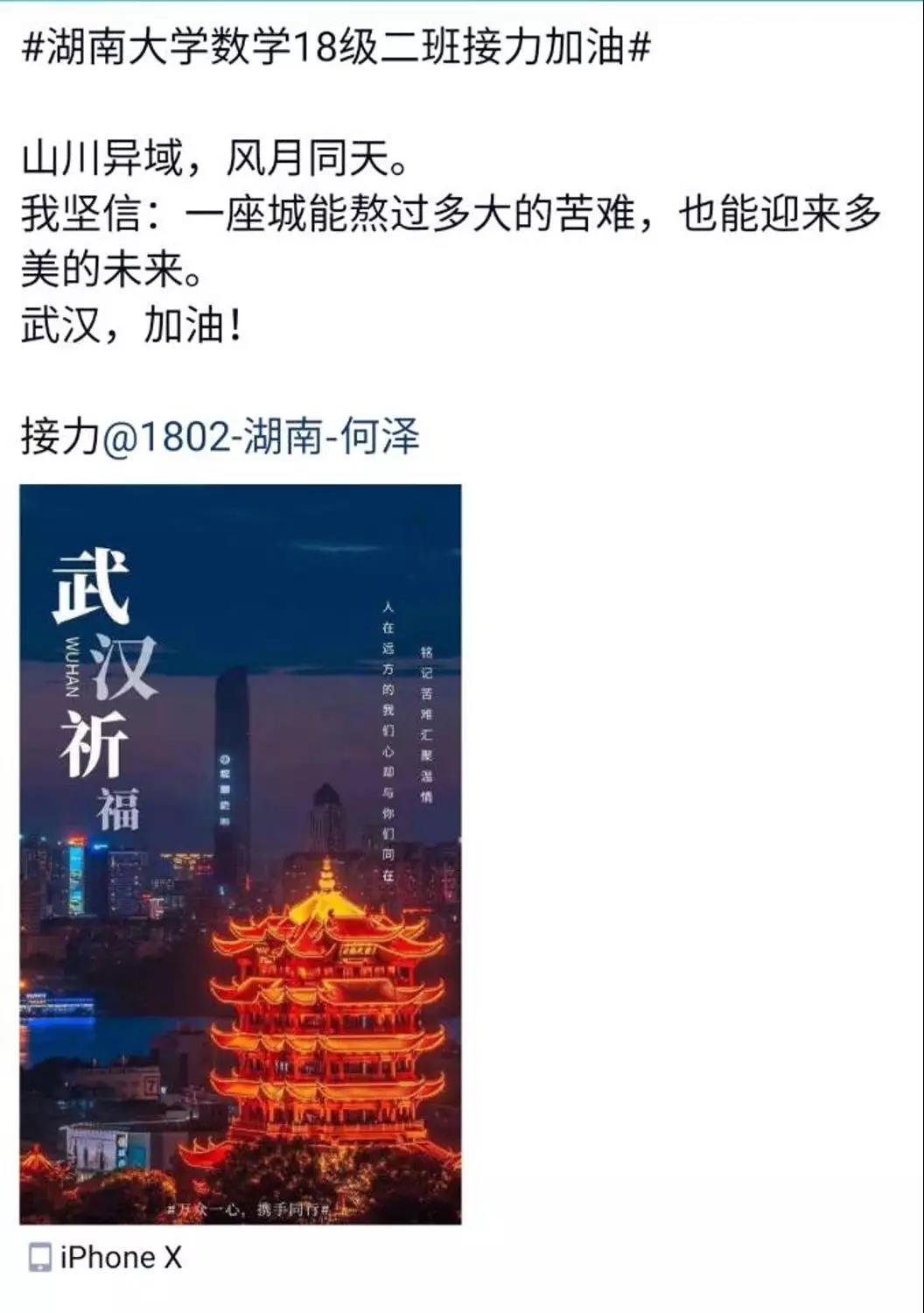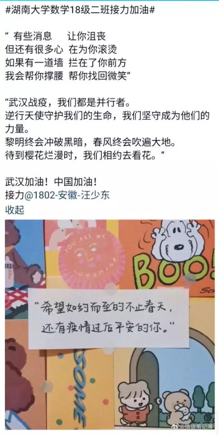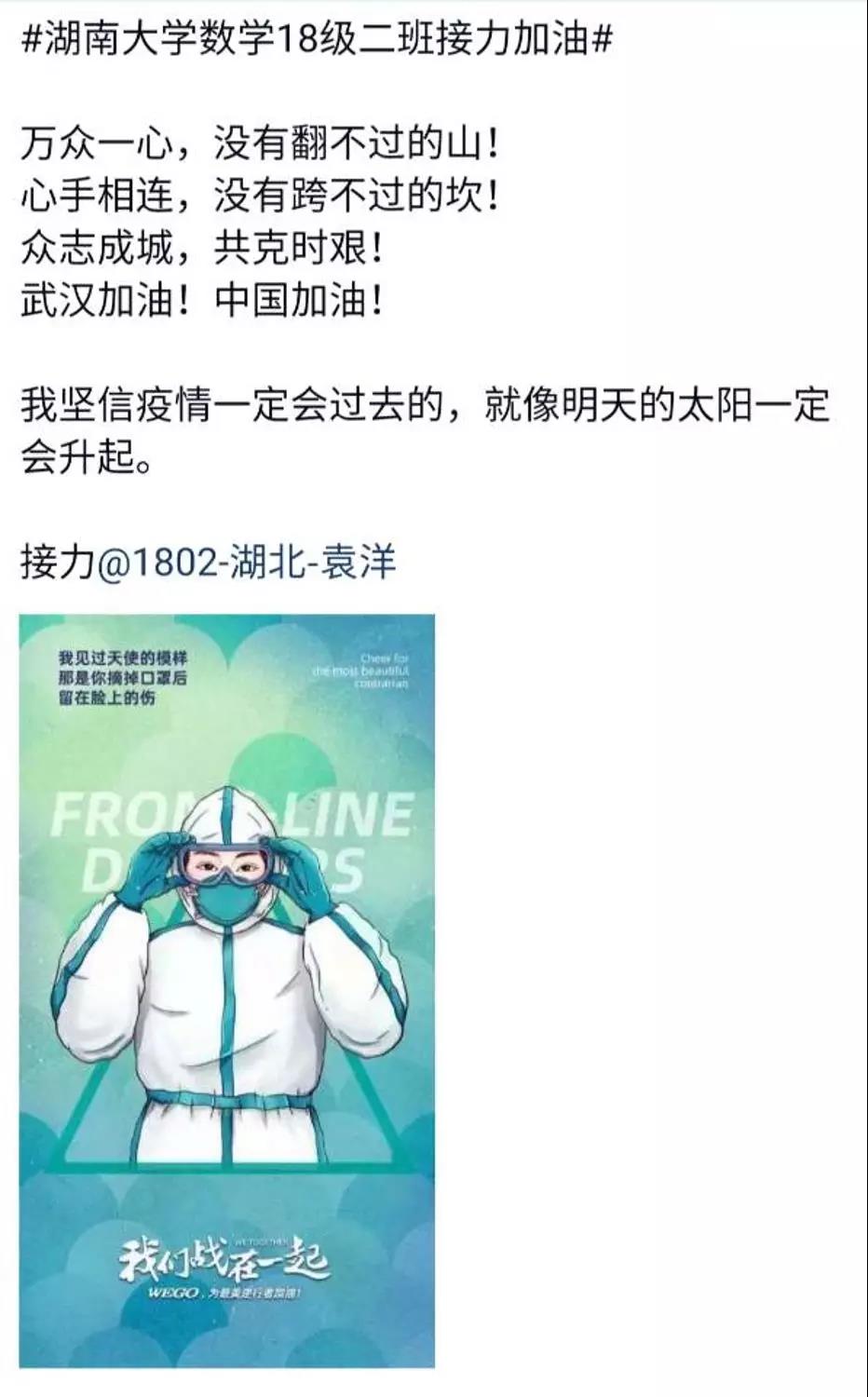 近日,色情文学 数学院1802班的同学们自发组织了一场线上“接力加油“活动,为中国祈福,为武汉加油!