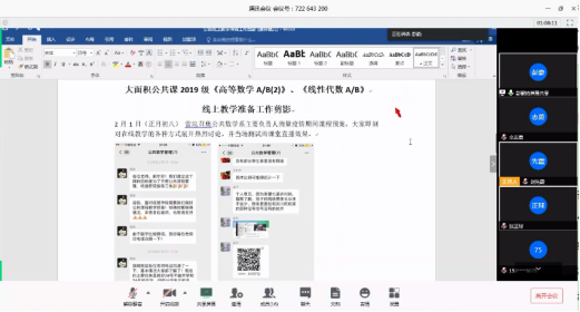 支部委员、大面积平台课程课程负责人彭豪、周金华、全志勇三位同志分别汇报了大面积平台课《高等数学2》、《线性代数》采取异步SPOC授课+QQ群答疑的教学方式,以及在各自班级所开展的线上教学情况。